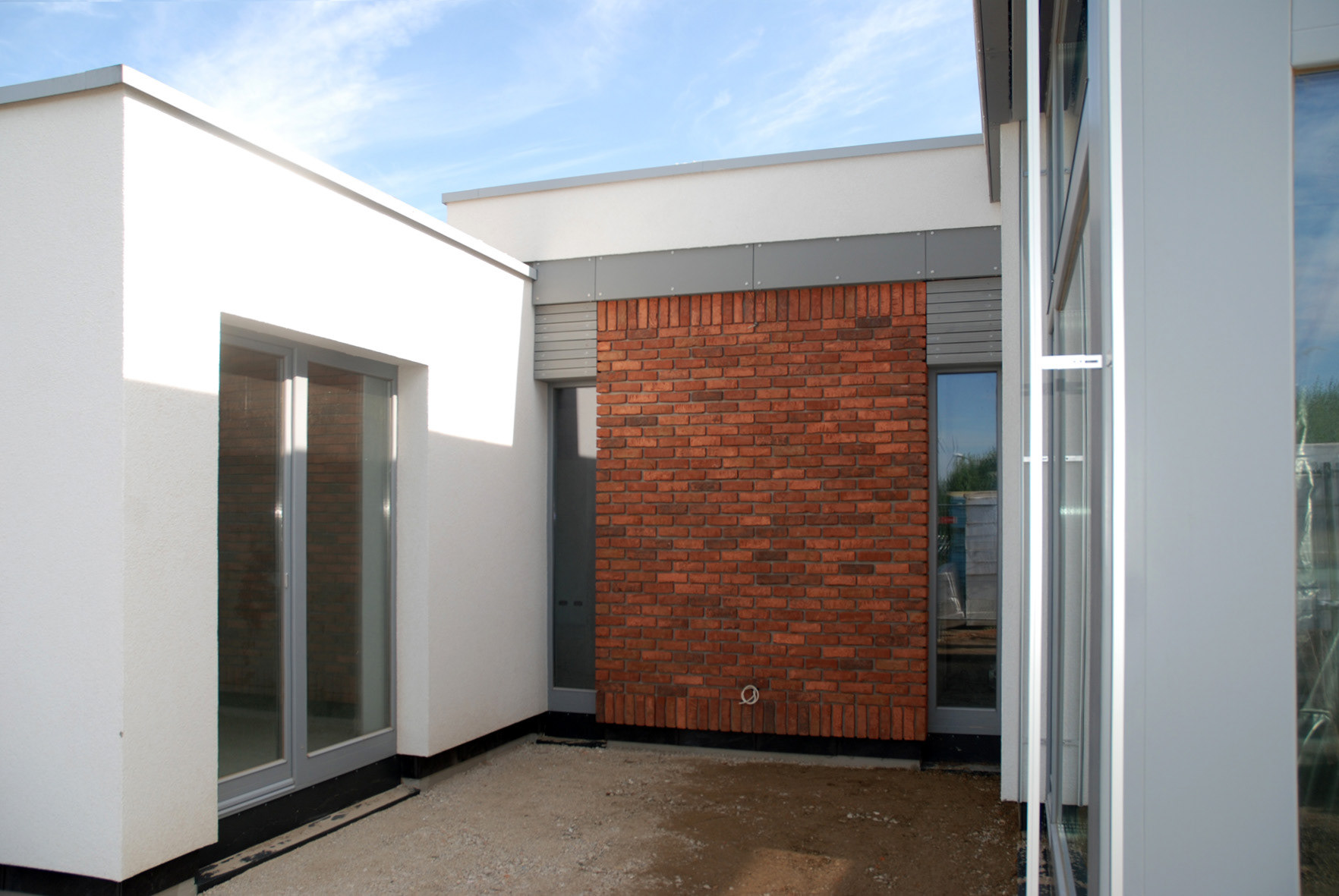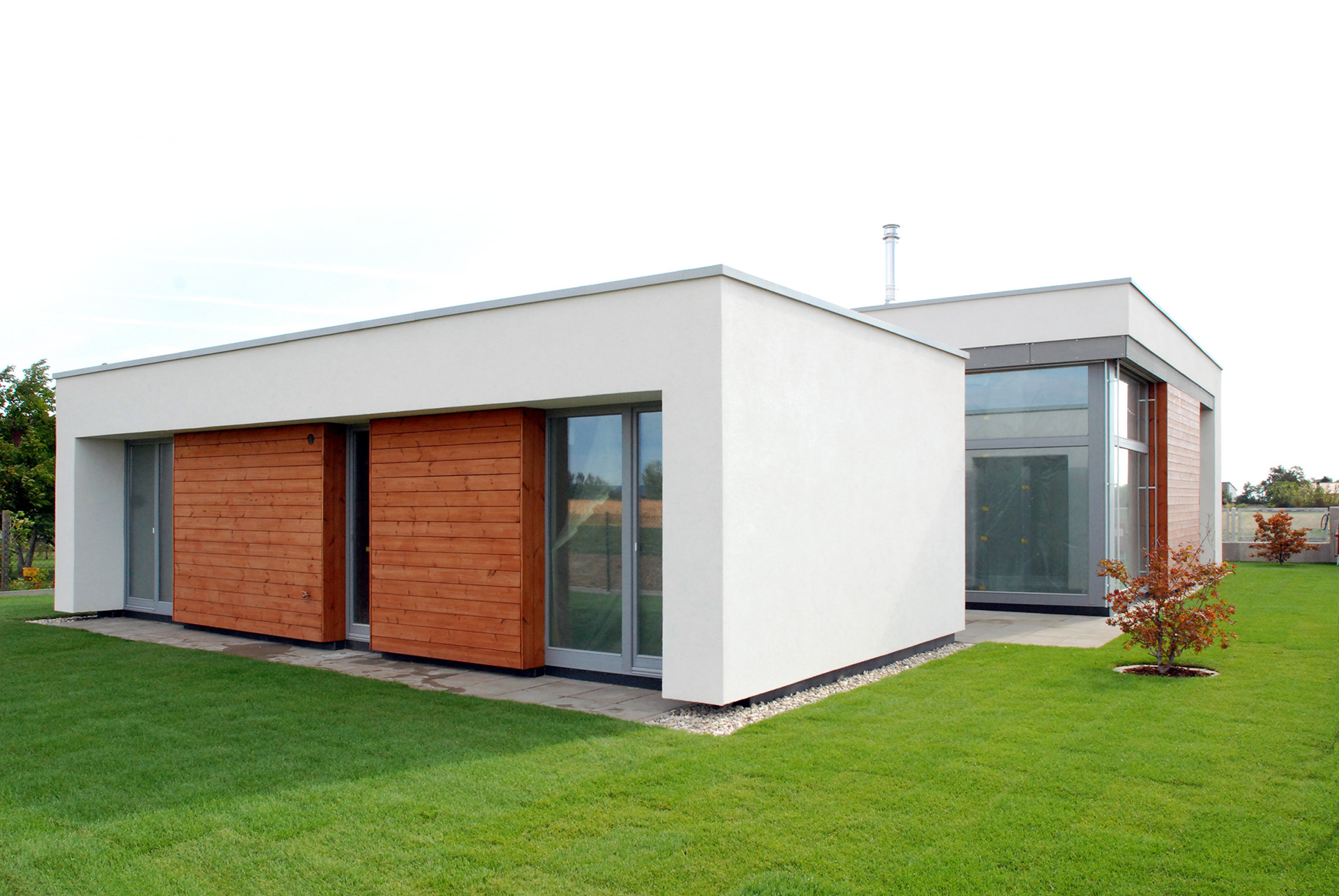 EN / The series of six planned family houses on the Pamastraße (Pama street) in Kittsee, which lies on ten kilometres away from the centre of Bratislava, is a small size development project from the ISE s.r.o. company and it fits their current ‘Living Concepts’ portfolio. The choice of the building site wasn’t coincidental. It almost ideally meets its purpose - to offer the residents a safe, quiet and cultural enviroment with an easy access to the nearby city. Our designed proposal included three options of family houses - two one-storey and one two-storey house. The characteristic architectural forming with the simple concept of intertwining volumes, the clean material design as well as the easy-to-read floor plan became the mutual signature of their design. After the feasibility study was handed over to the developer, he very quickly decided to move on to constructing one of the houses, which would be used as a showroom for potential residents.